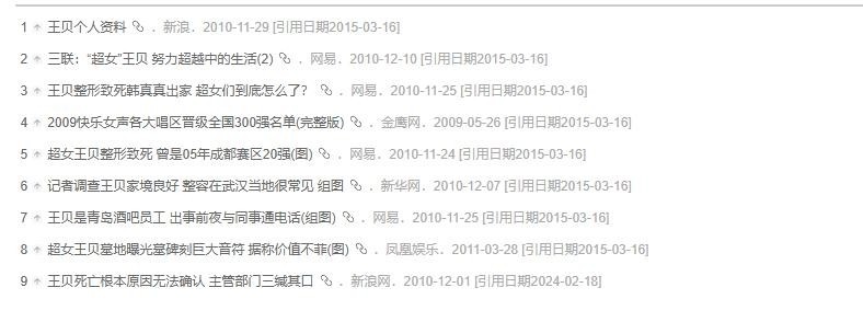 1. 2010年,一则突如其来的噩耗震动了整个娱乐界与公众舆论——年岁的“超女”“快女”参赛者王贝,在接受整形手术过程中不幸离世。